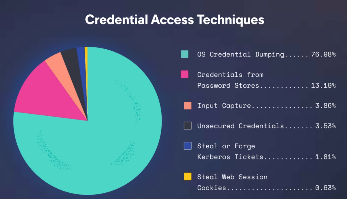 En 2022, se vio más de 4500 intentos de acceso a credenciales utilizando las siguientes técnicas (todas disponibles para la comunidad a través de los repositorios de reglas de detección o artefactos de protección en formatos de reglas compatibles):