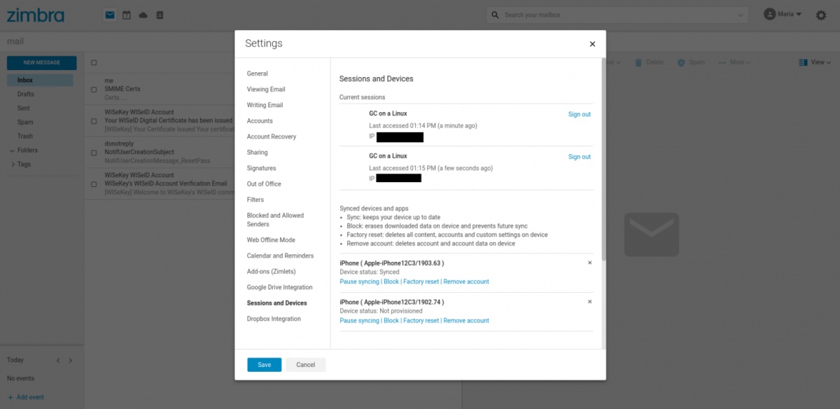 El Zimlet de administración de sesiones de usuario le permite ver todas sus sesiones activas y dispositivos móviles sincronizados desde la interfaz de usuario moderna sin preguntarle a su administrador. Para encontrar el Zimlet, haga clic en el menú de engranajes -> Configuración -> Sesiones y dispositivos.